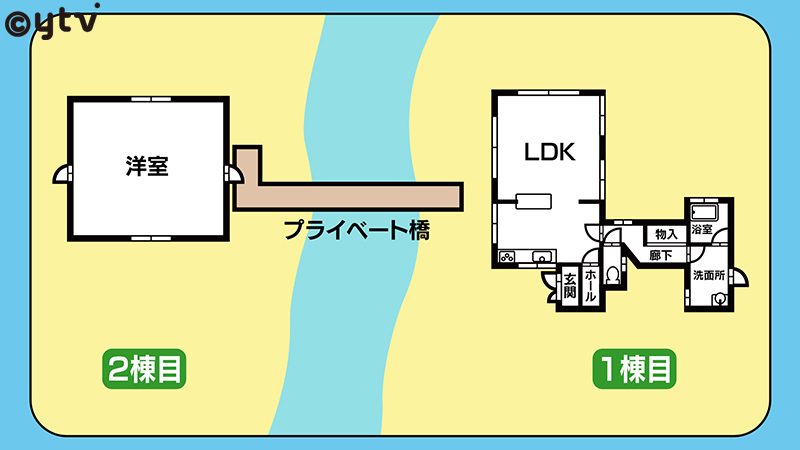 山の斜面に建つ物件は、元々別荘でLDKと水回りだけのシンプルな間取りだが、渓流を挟んだ向こう側にもう一棟もあり!そこは26帖のワンルームの間取り。トイレや風呂などを使う際は、もう1棟に移動しなければならないということで…元オーナー自ら2棟を行き来する“プライベート橋”を設置した素晴らしいギョーテン物件です!
