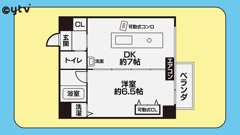 7帖のDKと6.5帖の洋室を可動式のスライド扉で仕切った1DK。